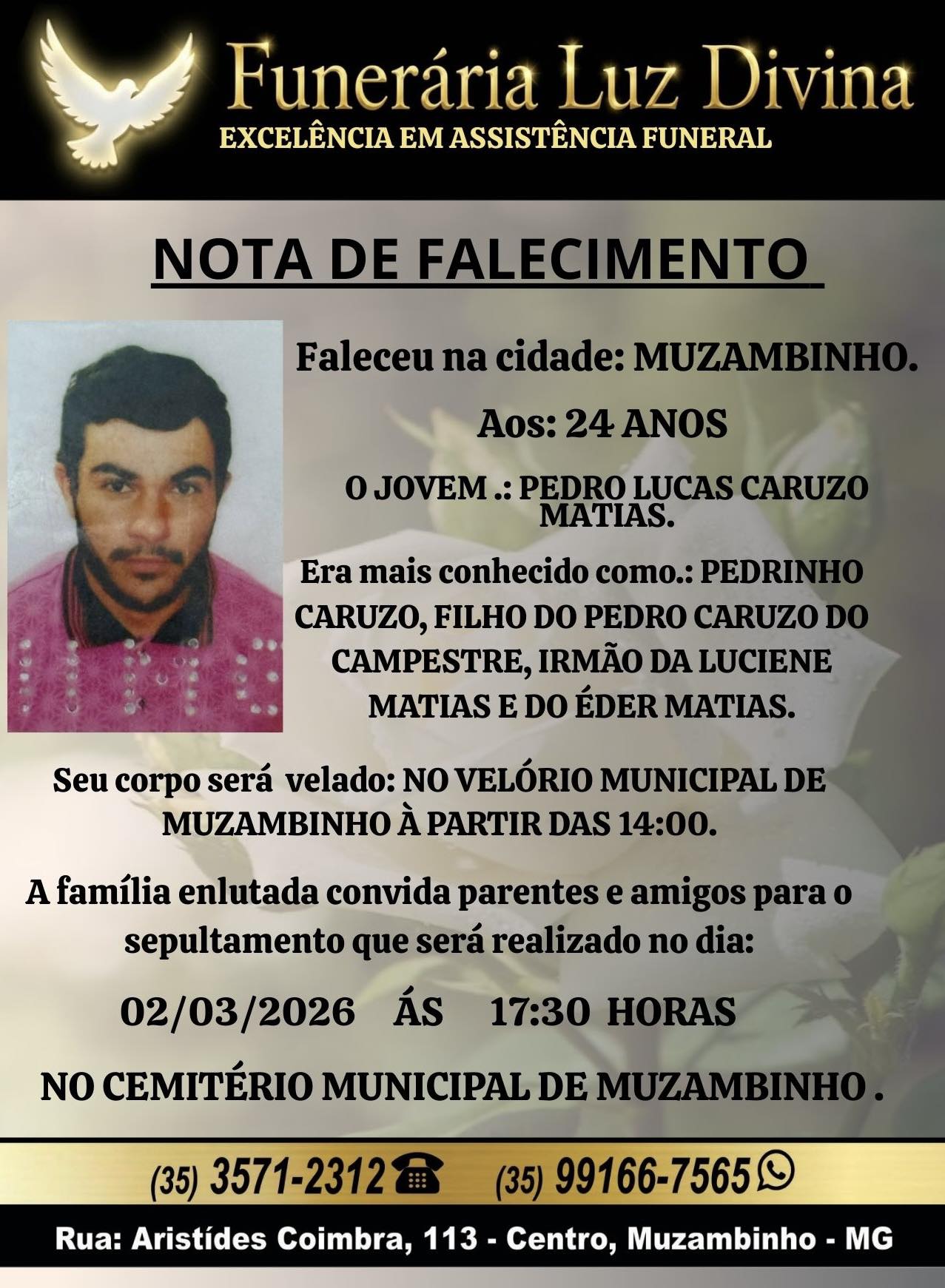 Mais Artigos DestaqueEconomia Conta de luz segue com bandeira verde, sem cobrança extra, em março DestaqueNossa CidadePrevisão do Tempo Última semana de verão terá chuva e instabilidade em Muzambinho, aponta previsão DestaqueEconomia PIS/Pasep 2026: quando é o pagamento do abono salarial em março?DestaqueObituárioFaleceu aos 24 anos o jovem Pedro Lucas Caruzo Matias Redação2 de março de 20261min0Informou a Funerária Luz DivinaA família enlutada, nossos sinceros sentimentos de pesares, que Deus os abençoe e conforte. Post Views: 6EnterroFuneráriaLuz DivinamorteobituárioSepultamentoVelório