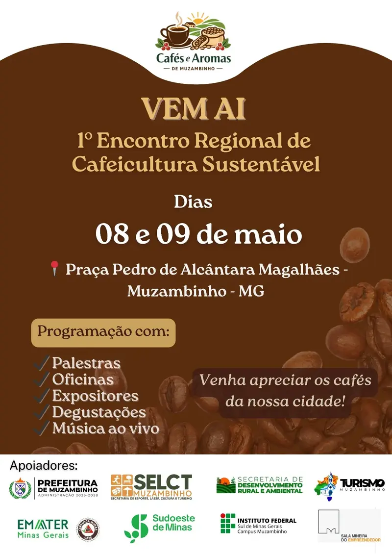 Com o tema “Cafés e Aromas de Muzambinho”, o encontro contará com palestras, oficinas, exposição de produtos, degustações e apresentações musicais. A proposta é criar um espaço de troca de experiências e conhecimento, incentivando o fortalecimento da cadeia produtiva do café na região, que é uma das principais atividades econômicas do Sul de Minas.