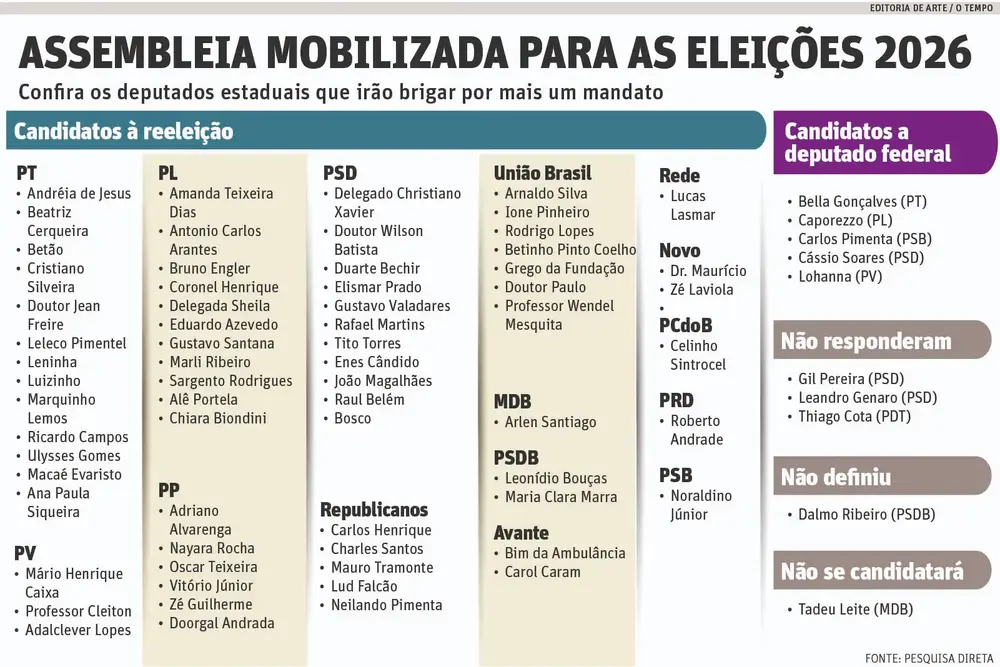 Outros cinco parlamentares vão redirecionar seu projeto político para a Câmara dos Deputados. Com isso, dos 77 deputados estaduais, 72 vão disputar as eleições deste ano. Entre os cinco restantes, três não responderam à reportagem, um disse que ainda não definiu e apenas o presidente da Casa, Tadeu Leite (MDB), não vai disputar uma vaga no pleito de outubro. Ele foi eleito conselheiro do Tribunal de Contas do Estado de Minas Gerais (TCE-MG) em março e deve tomar posse assim que encerrar o mandato, no início de 2027.