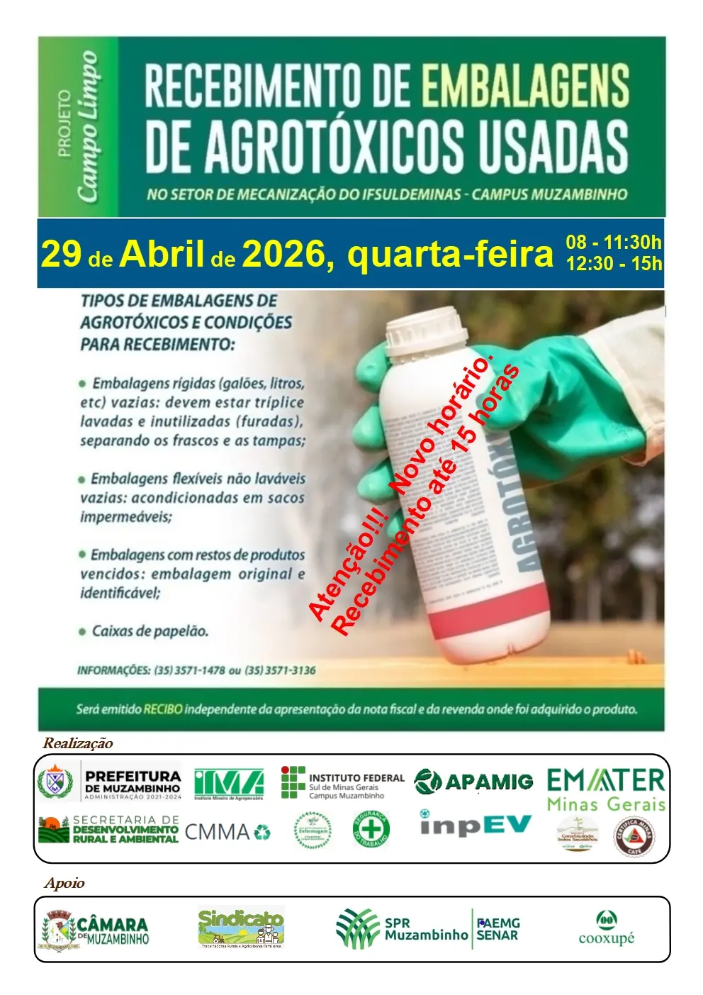 Produtores rurais de Muzambinho e região terão uma nova oportunidade de realizar o descarte correto de embalagens de agrotóxicos. O Projeto Campo Limpo promove, no dia 29 de abril de 2026 (quarta-feira), uma ação de recebimento desses materiais no setor de mecanização do IFSULDEMINAS – Campus Muzambinho.